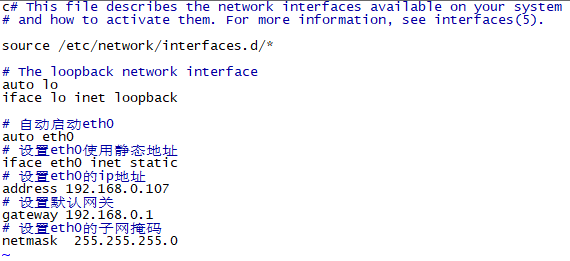 # 自动启动eth0 auto eth0 # 设置eth0使用静态地址 iface eth0 inet static # 设置eth0的ip地址 address 192.168.0.107 # 设置默认网关 gateway 192.168.0.1 # 设置eth0的子网掩码 netmask 255.255.255.0
