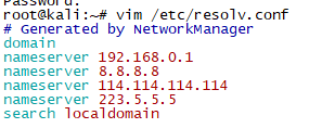 root@kali:~# vim /etc/resolv.conf # Generated by NetworkManager domain nameserver 192.168.0.1 nameserver 8.8.8.8 nameserver 114.114.114.114 nameserver 223.5.5.5 search localdomain