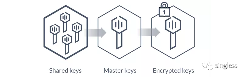 vault保存在Backend中的数据都是加密的。需要用密钥进行解密,这个密钥在vault中称为master key,master key需要手动创建。vault会使用shamir算法将master key切分成M份shared key,管理员需要至少提供其中N份shared key才能还原出master key(M和N都可配置,M≥N)。