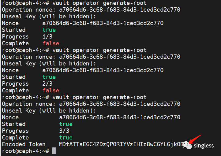 下面来重新生成root token,会提示我们输入shared key,因为我们默认是需要三个shared key来生成master key,所以命令需要执行三次。最后一次命令执行时,会生成一个encoded token,我们使用otp可以将它解码为root token
