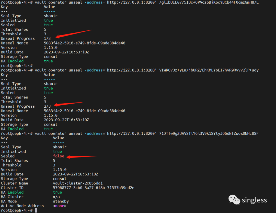 可以看到,在提供key时,unseal progress的数量一直在增加,当我们提供3个key 后,vault的sealed变为false状态,解封成功。