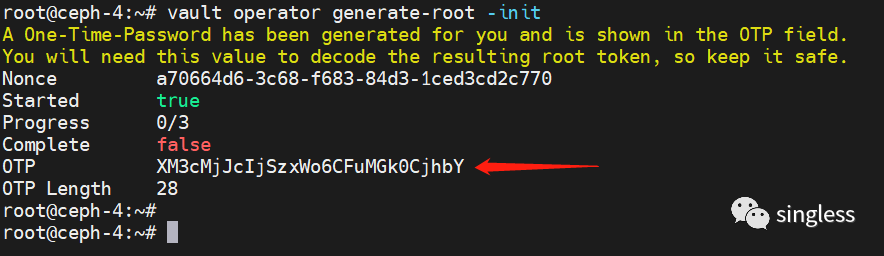 root@ceph-4:~# vault operator generate-root -init ##生成OPT密码,这个密码我们需要记住,后面需要用到