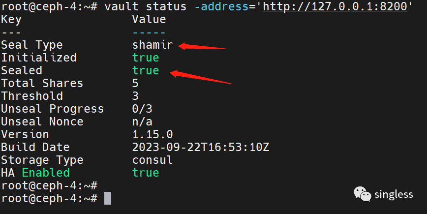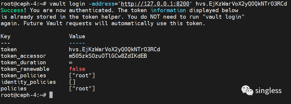 root@ceph-4:~# export VAULT_ADDR=http://127.0.0.1:8200 ##为了不用每次都输入一个-address参数,我们定义一个VAULT_ADDR的变量