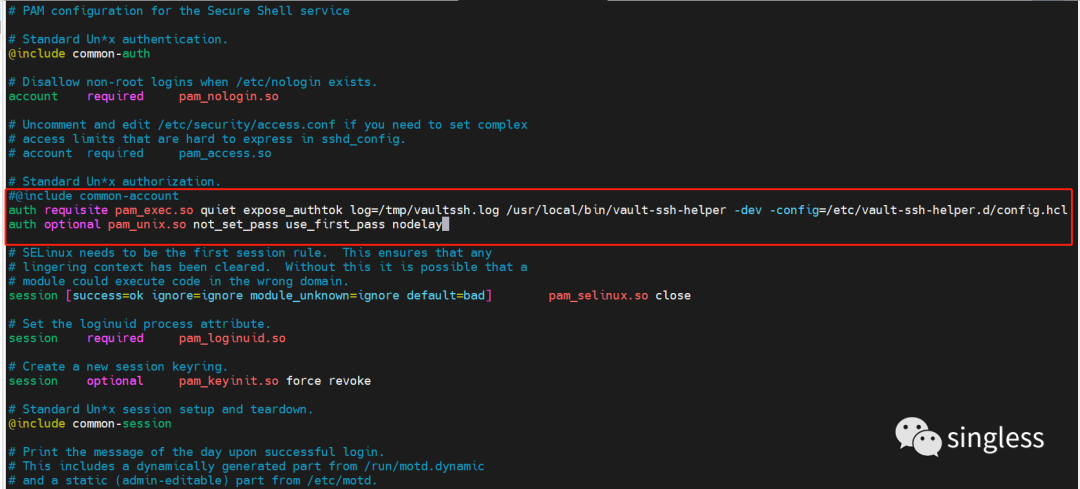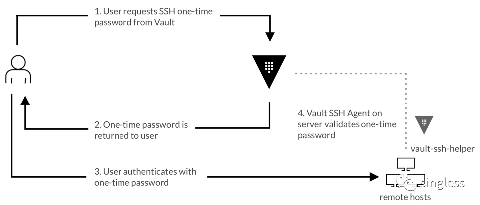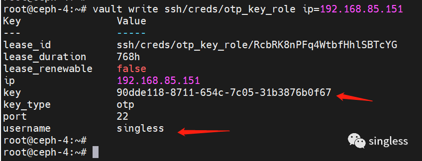 ip为运行vault-ssh-helper的服务器ip,key为生成的otp密码,通过username一行可以知道,otp是为singless用户生成的。