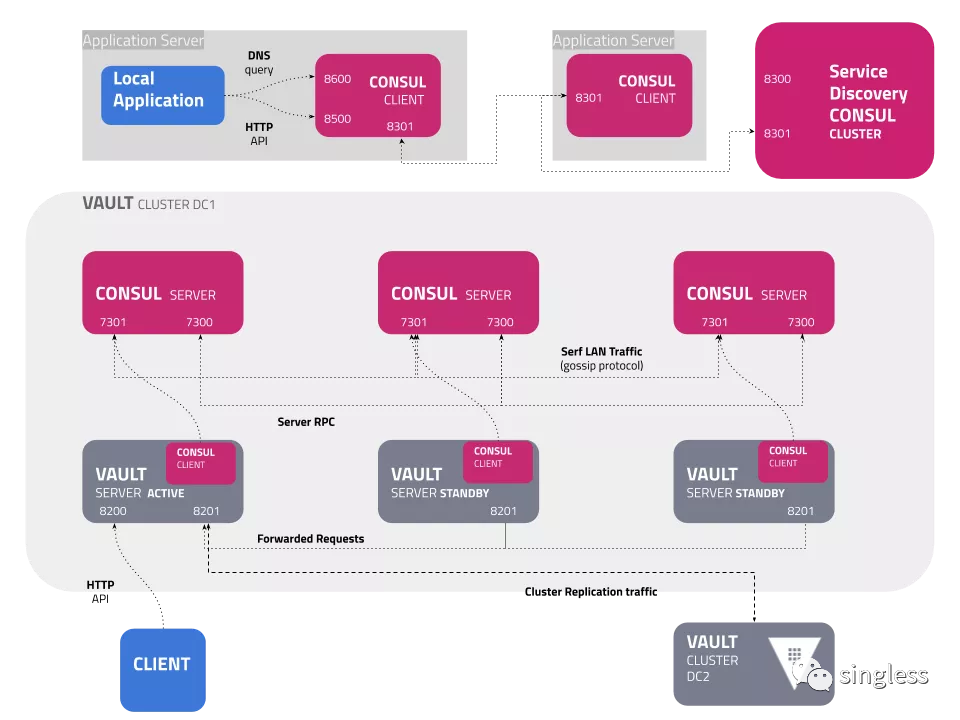 HashiCorp 推荐使用 Consul 作为 Vault 的数据存储 Backend(推荐但并不强制,Vault 支持丰富的数据存储 Backend)。本文使用consul作为vault的后端存储。