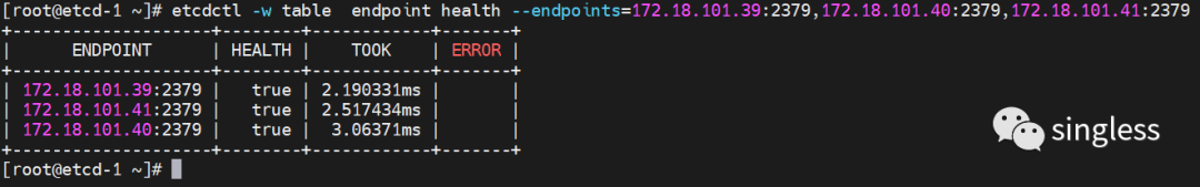 [root@etcd-1 ~]# etcdctl -w table endpoint health --endpoints=172.18.101.39:2379,172.18.101.40:2379,172.18.101.41:2379