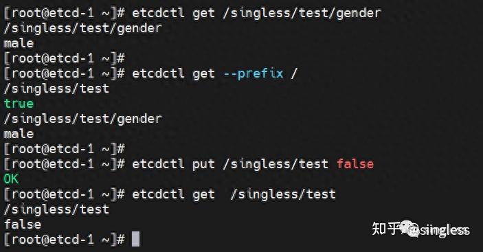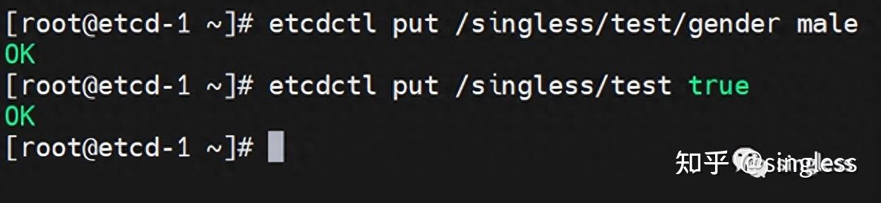 [root@etcd-1 ~]# etcdctl put /singless/test true ##创建一个键/singless/test,值为test