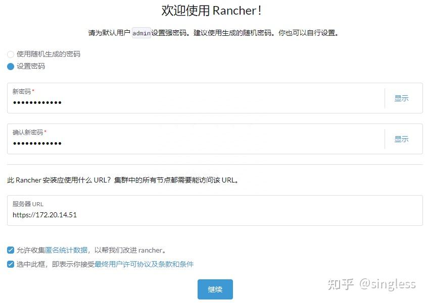 通过https://ip:443访问rancher,默认用户名为admin,第一次访问时rancher会提示如何获取登录密码