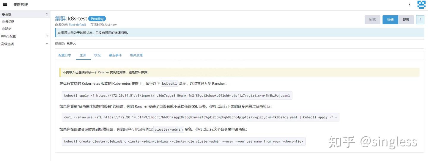 [root@k8s-master01 ~]# curl --insecure -sfL https://172.20.14.51/v3/import/hb8dn7sggz8r86ghxn4n2f89gdj2cbwpkq69lch64pjpfjz7vvgjzj_c-m-fk8bz9cj.yaml | kubectl apply -f - ##该操作会创建集群角色、命名空间、sa、deployment等资源