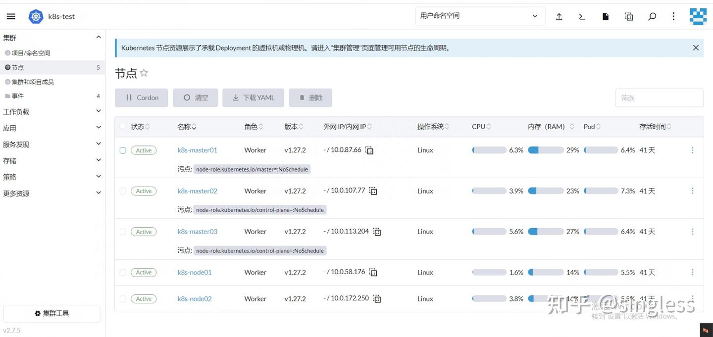 点击集群详情,我们能看到pod、node、namespace等信息及监控数据,并且可以进行相应的管理操作。