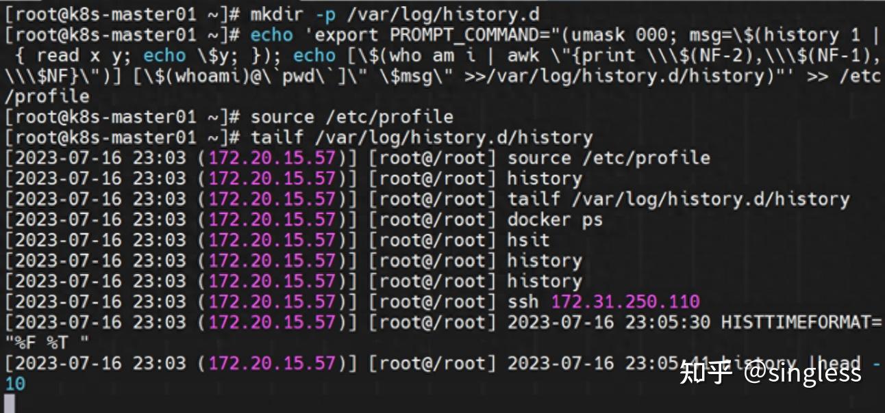 [root@k8s-master01 ~]# echo 'export PROMPT_COMMAND="(umask 000; msg=\$(history 1 | { read x y; echo \$y; }); echo [\$(who am i | awk \"{print \\\$(NF-2),\\\$(NF-1),\\\$NF}\")] [\$(whoami)@\`pwd\`]\" \$msg\" >>/var/log/history.d/history)"' >> /etc/profile