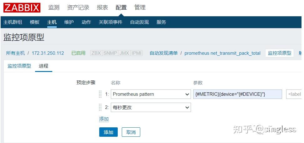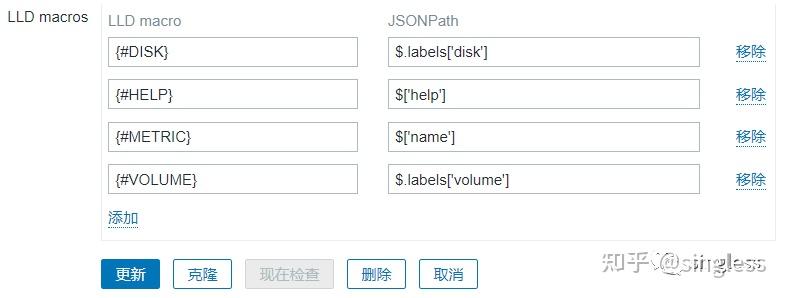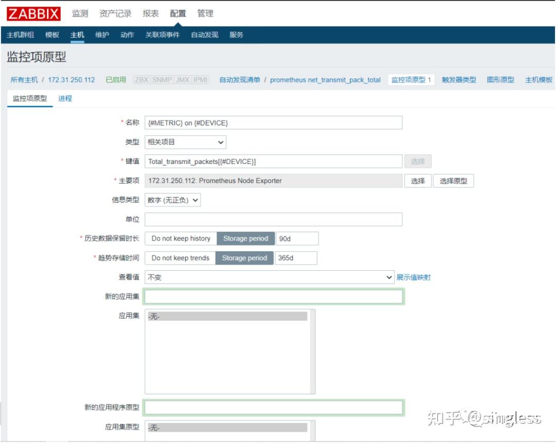 选择刚创建好的LLD自动发现规则,点击监控项原型,创建监控项原型。
