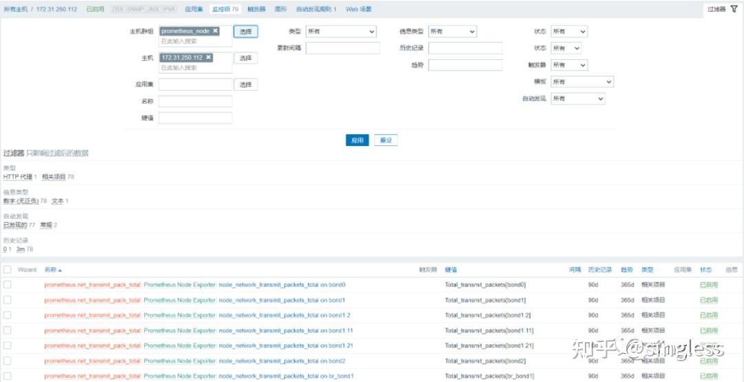 点击配置-->主机-->监控项可以发现通过我们刚刚配置的自动发现规则已经自动创建了多个网卡相关的监控项