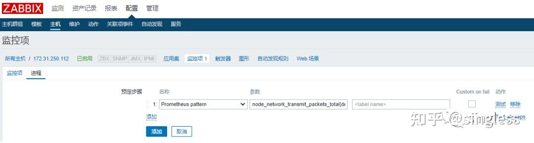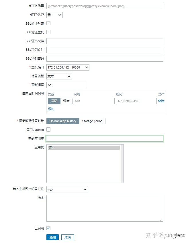 该代理的作用为为后续的监控项提供数据来源,进入刚创建的主机页面,点击监控项,填写以下信息,创建一个http代理类型的监控项。
