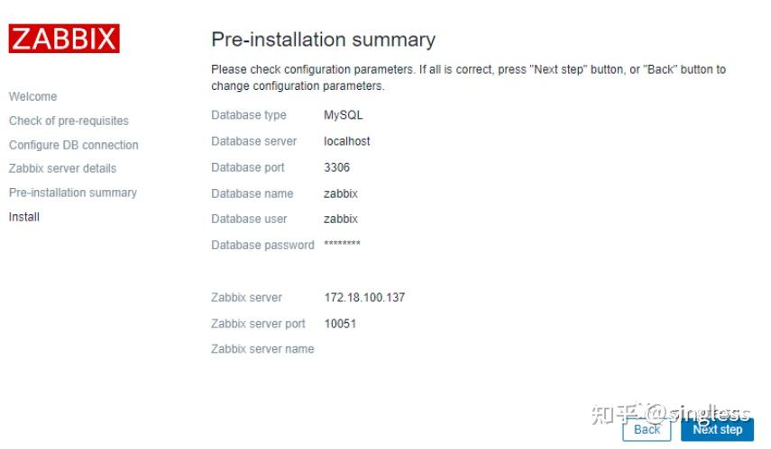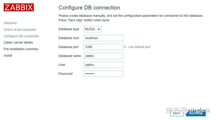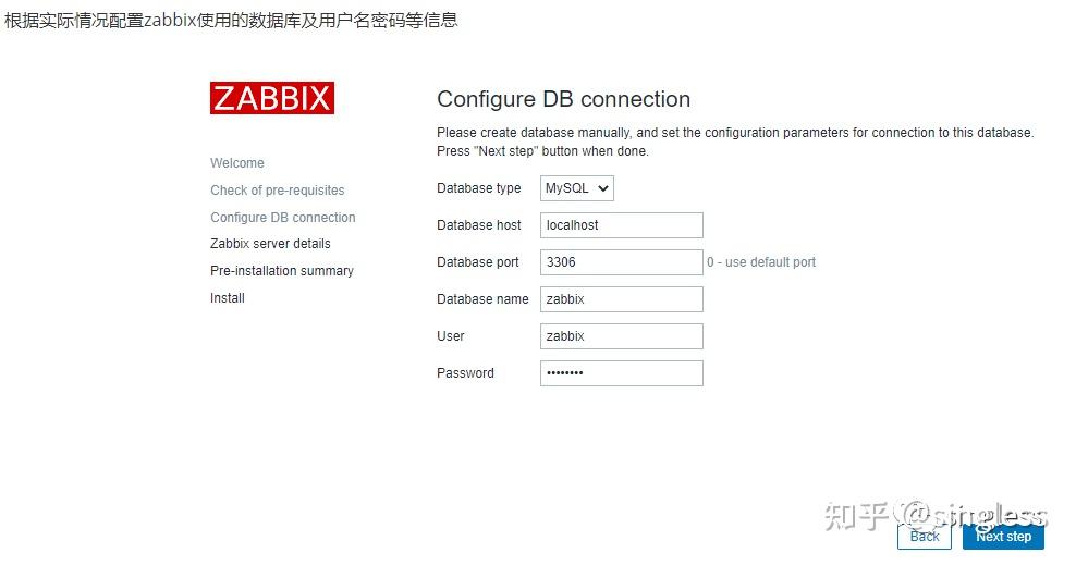 根据实际情况配置zabbix使用的数据库及用户名密码等信息