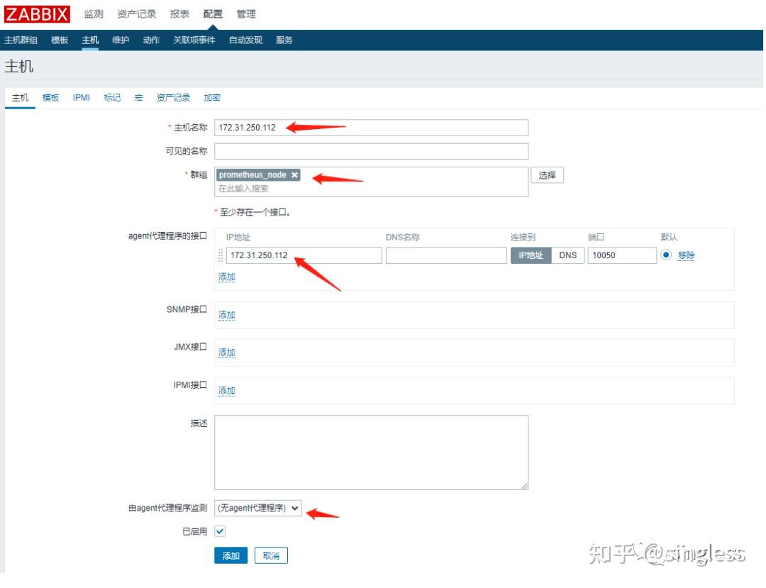 创建一个主机,填写好以下信息,主机无需安装任何zabbix代理