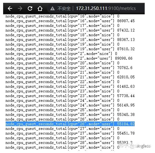 上述输出中高亮部分,node_cpu_guest_seconds_total为metric名,cpu、mode为label名,26和user为两个lable的值。55184.82为metric的实际值。