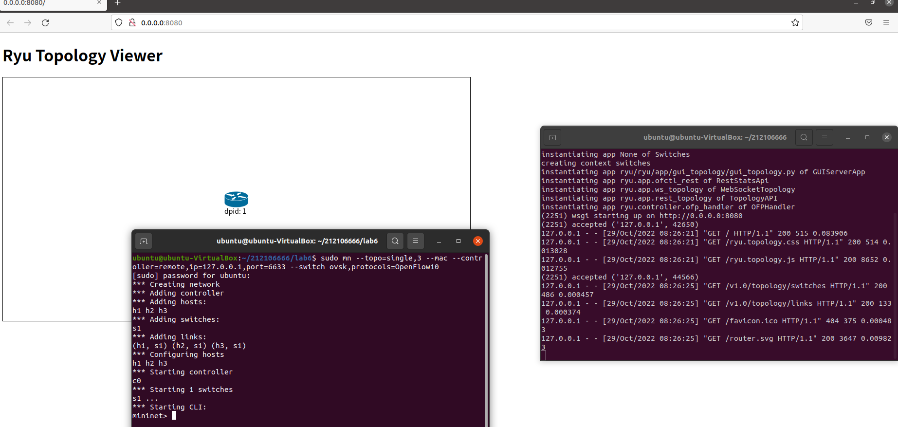 1.搭建下图所示SDN拓扑,协议使用Open Flow 1.0,并连接Ryu控制器