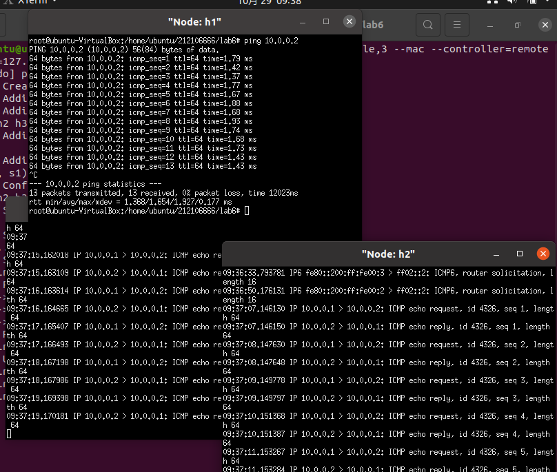 2.阅读Ryu文档的The First Application一节,运行并使用 tcpdump 验证L2Switch,分析和POX的Hub模块有何不同