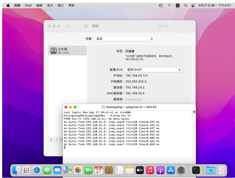 同时在 macOS 中配置本机静态 IP 地址和对应 AD 域的 DNS 地址;