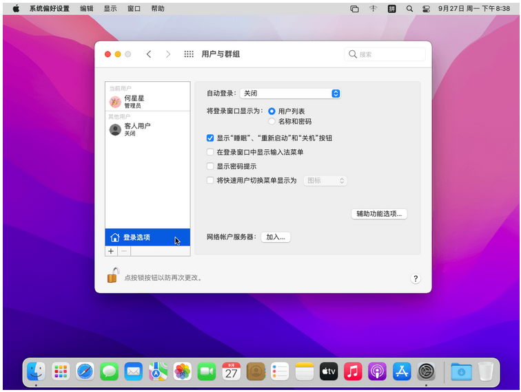 选择左侧下方的【登录选项】,再点击【网络账户服务器】的【加入】按钮;
