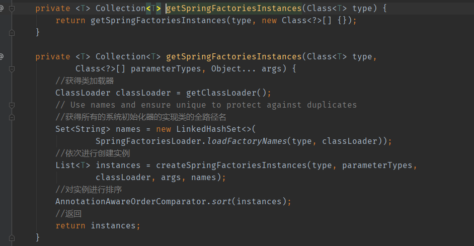 先进入getSpringFactoriesInstances(ApplicationContextInitializer.class)方法