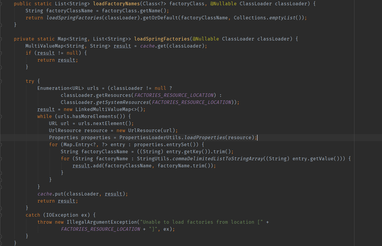 (2)、通过classLoader去加载资源路径,FACTORIES_RESOURCE_LOCATION = "META-INF/spring.factories",会读取这个文件,会获取所有的jar包中的文件