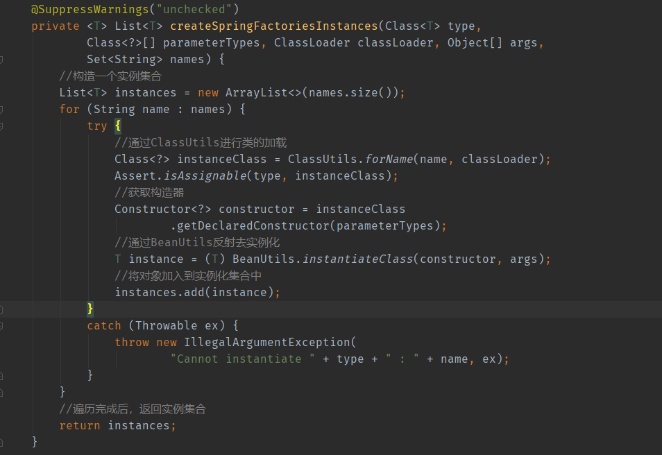 3、调用createSpringFactoriesInstances方法依次创建实例