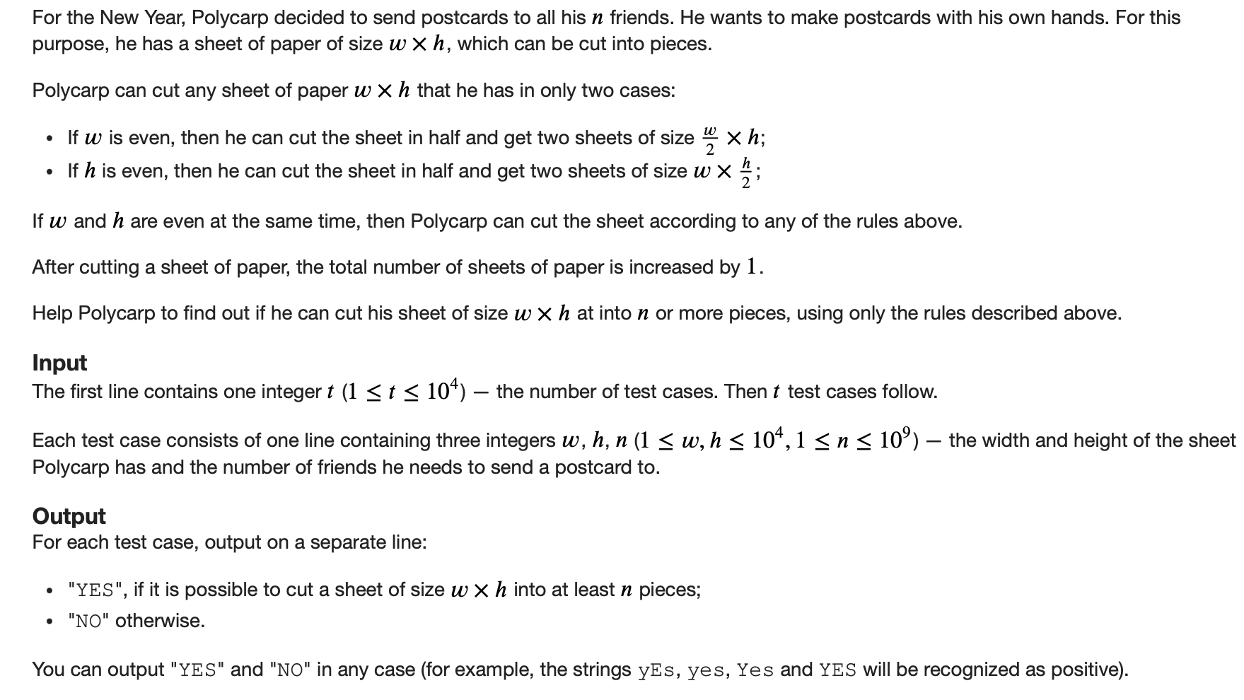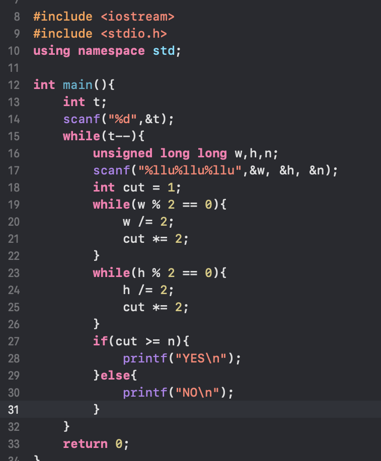 进行循环,内容是在每条边偶数遍(只有当边值为偶数时才能切)在切无可切之前,每次使cut乘以2,另一条边同样处理,最终得出这张纸最多能够切出的分数cut,再比较最大的cut与n的大小是否符合要求