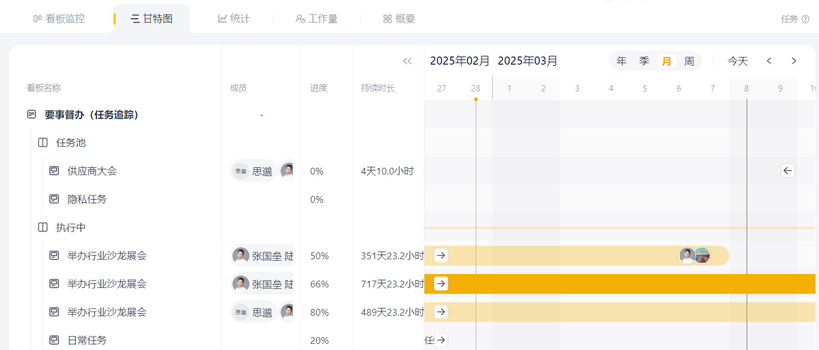三维可视化:通过多层级卡片布局实现项目总览、部门看板、个人待办的全流程管理,支持拖拽更新任务状态,实时显示进度与责任人;数据仪表盘自动生成任务工时匹配报告,以热力图展示成员负载并红色预警超期任务与资源过载;甘特图视图可一键切换项目时间线并智能识别任务依赖关系。