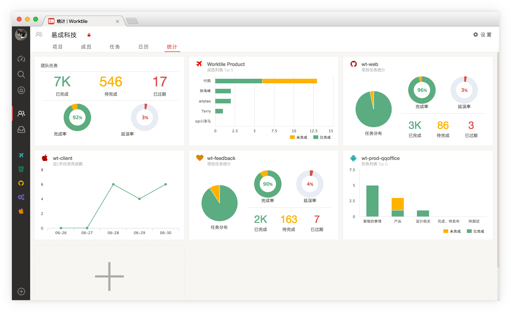 Worktile 集成任务管理、OKR 与工时统计,适合业务灵活的团队进行多维度数据分析;