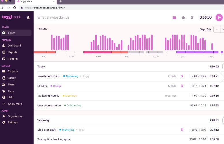 Toggl Track 的极简计时器设计,尤其适合自由职业者或创意岗位的个人时间记录。