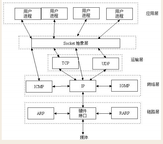 TCP/IP协议族是一个四层协议系统,自底而上分别是数据链路层、网络层、传输层和应用层。每一层完成不同的功能,且通过若干协议来实现,上层协议使用下层协议提供的服务。