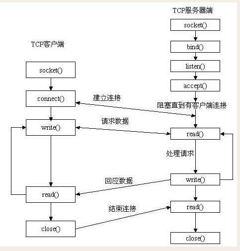 int socket(int domain, int type, int protocol):创建一个新的套接字,返回套接字描述符int bind(int sockfd,struct sockaddr * my_addr,int addrlen):为套接字指明一个本地端点地址TCP/IP协议使用sockaddr_in结构,包含IP地址和端口号,服务器使用它来指明熟知的端口号,然后等待连接int listen(int sockfd,int input_queue_size):面向连接的服务器使用它将一个套接字置为被动模式,并准备接收传入连接。用于服务器,指明某个套接字连接是被动的int accept(int sockfd, struct sockaddr *addr, int *addrlen):获取传入连接请求,返回新的连接的套接字描述符int connect(int sockfd,struct sockaddr *server_addr,int sockaddr_len):同远程服务器建立主动连接,成功时返回0,若连接失败返回-1。int send(int sockfd, const void * data, int data_len, unsigned int flags):在TCP连接上发送数据,返回成功传送数据的长度,出错时返回-1int recv(int sockfd, void *buf, int buf_len,unsigned int flags):从TCP接收数据,返回实际接收的数据长度close(int sockfd):撤销套接字