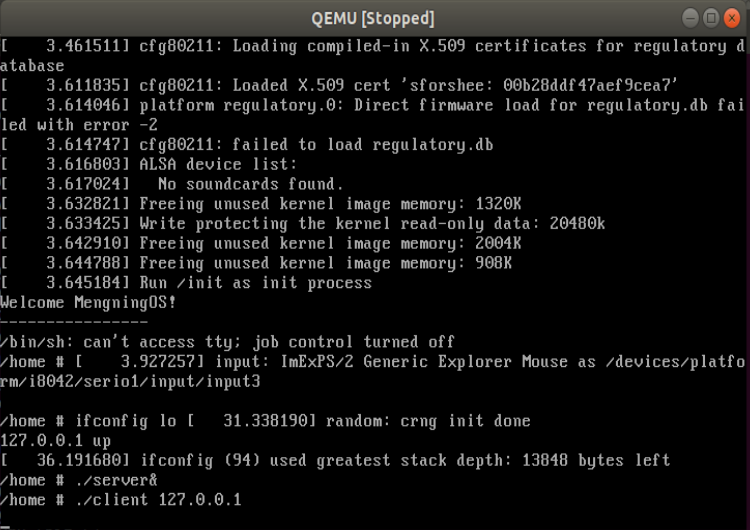 10)在QEMU中,后台启动server.c程序,配置环路地址,以环路地址为参数启动client,此时二者开始相互通信