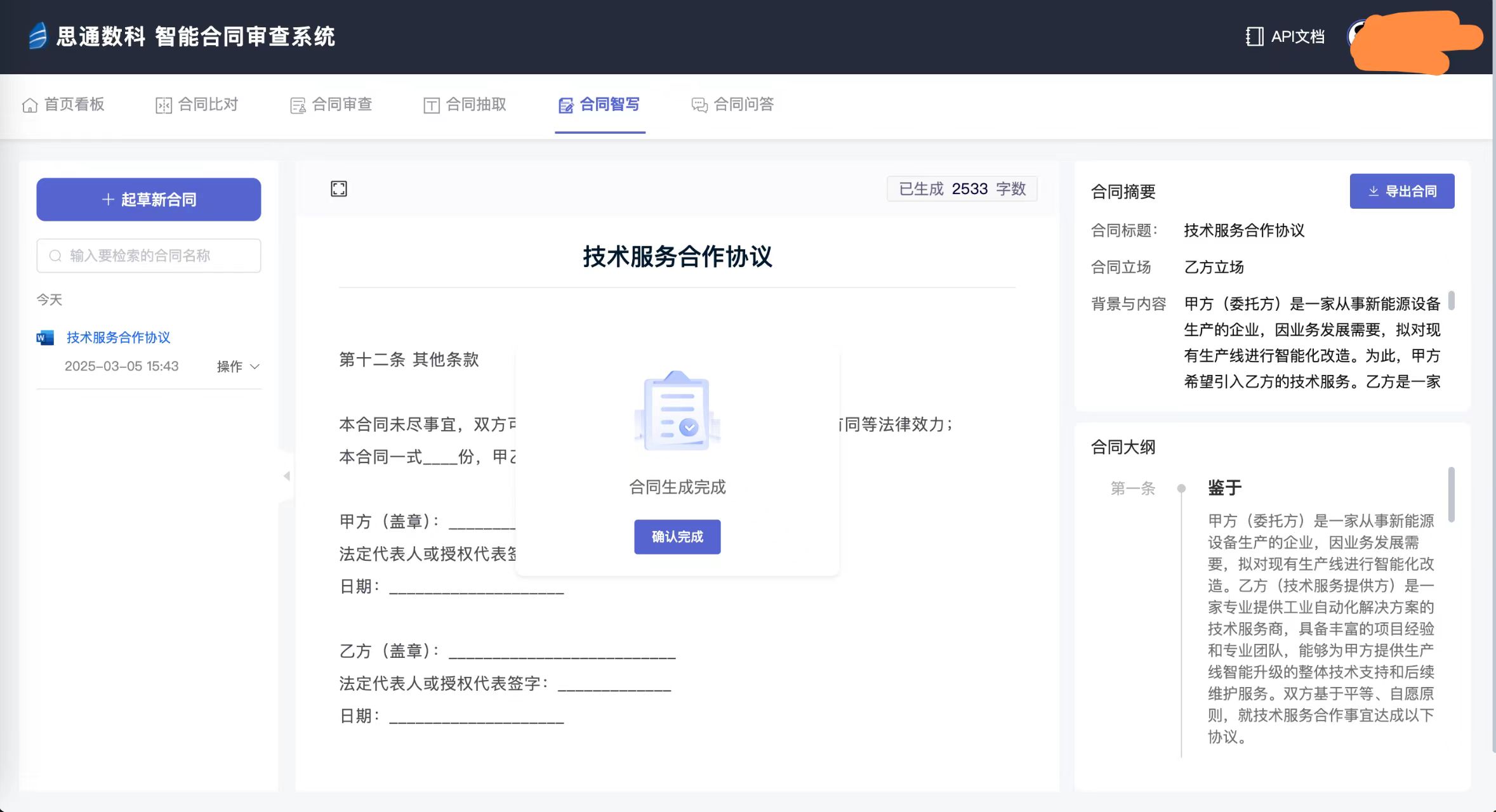 (3)场景示例: 某建筑企业上传工程合同时,系统10秒内提示“未明确不可抗力责任归属”,并关联3份类似案例的修改方案,直接规避潜在纠纷。