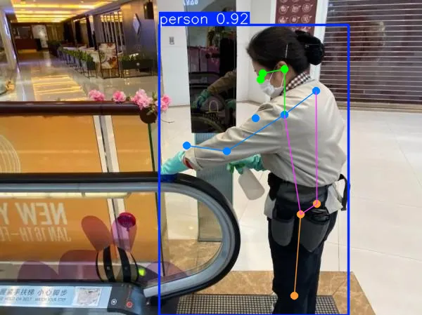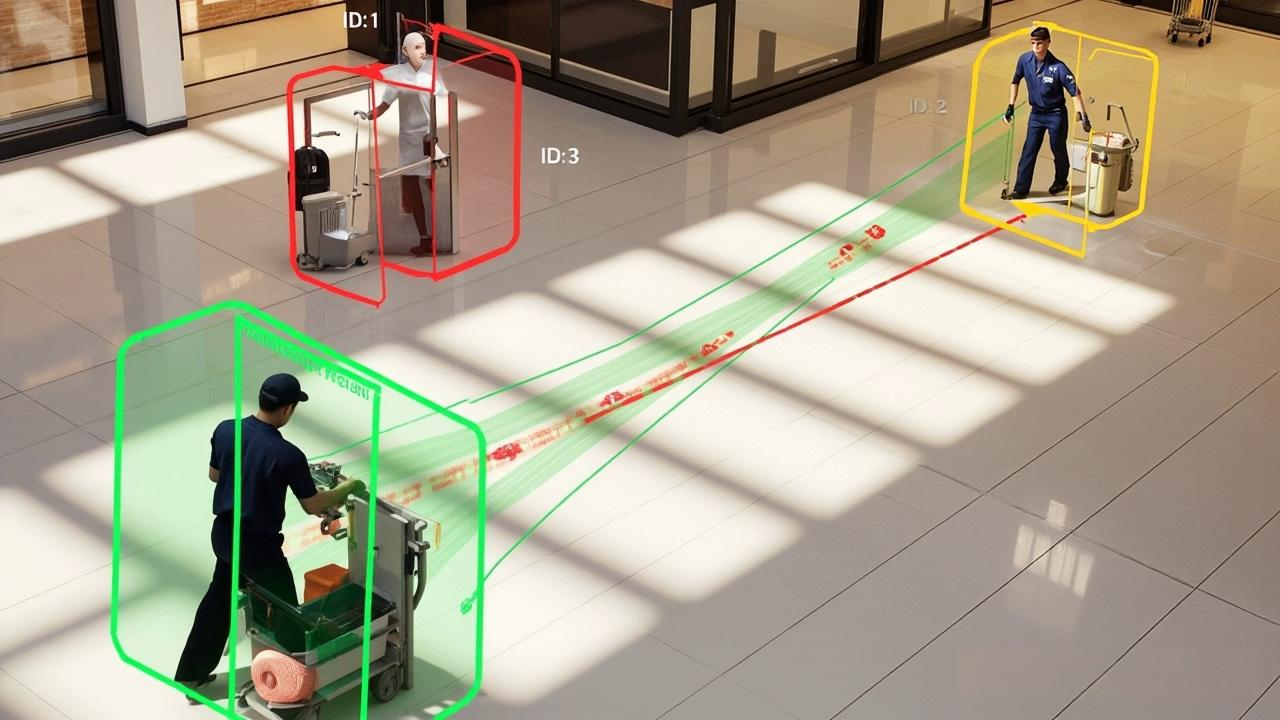 在监控画面标注虚拟检测线,统计特定点位(如休息区至垃圾站)的往返次数