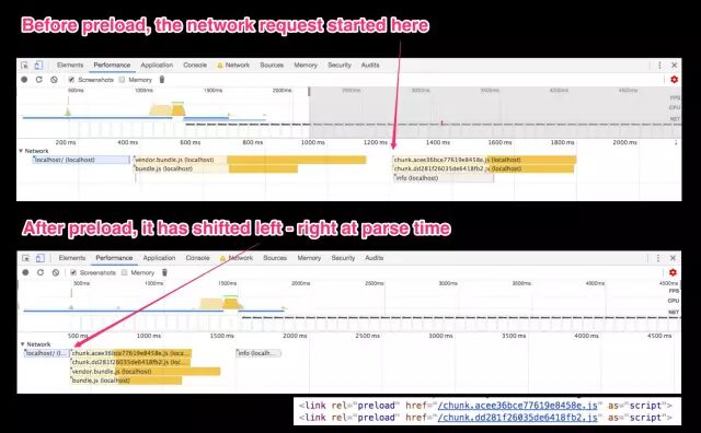 preload 将资源获取与执行解耦,像这样,preload 在标记中声明以被 Chrome preload 扫描器扫描。这意味着,在许多案例中,在 HTML 解析器获取到标签之前,preload 就会被获取(用它声明的优先级)。这将会比自定义的 preload 更加强大。