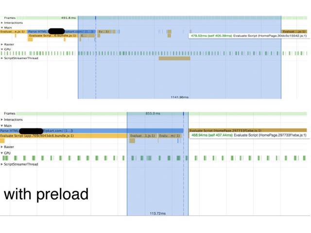 同样的,在对自己的渐进式 Web 应用程序主要打包文件使用 preload 之后,Flipkart 在路由解析之前 节省了大量的主线程空闲时间(在 3G 网络下的低性能手机下)。