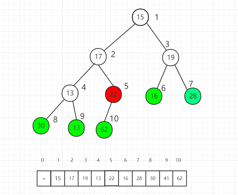 索引 5 位置进行 shift down 操作后,22 和 62 交换位置。