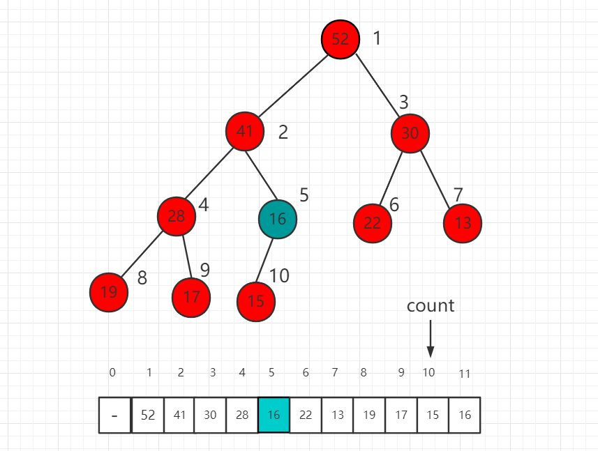 假设我们对下面的最大堆新加入一个元素52,放在数组的最后一位,52大于父节点16,此时不满足堆的定义,需要进行调整。