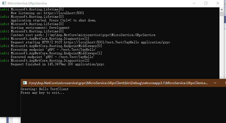 先启动服务项目再启用客户端项目,即可看到 客户端通过 gRPC 调用的方式从服务端返回来的信息。