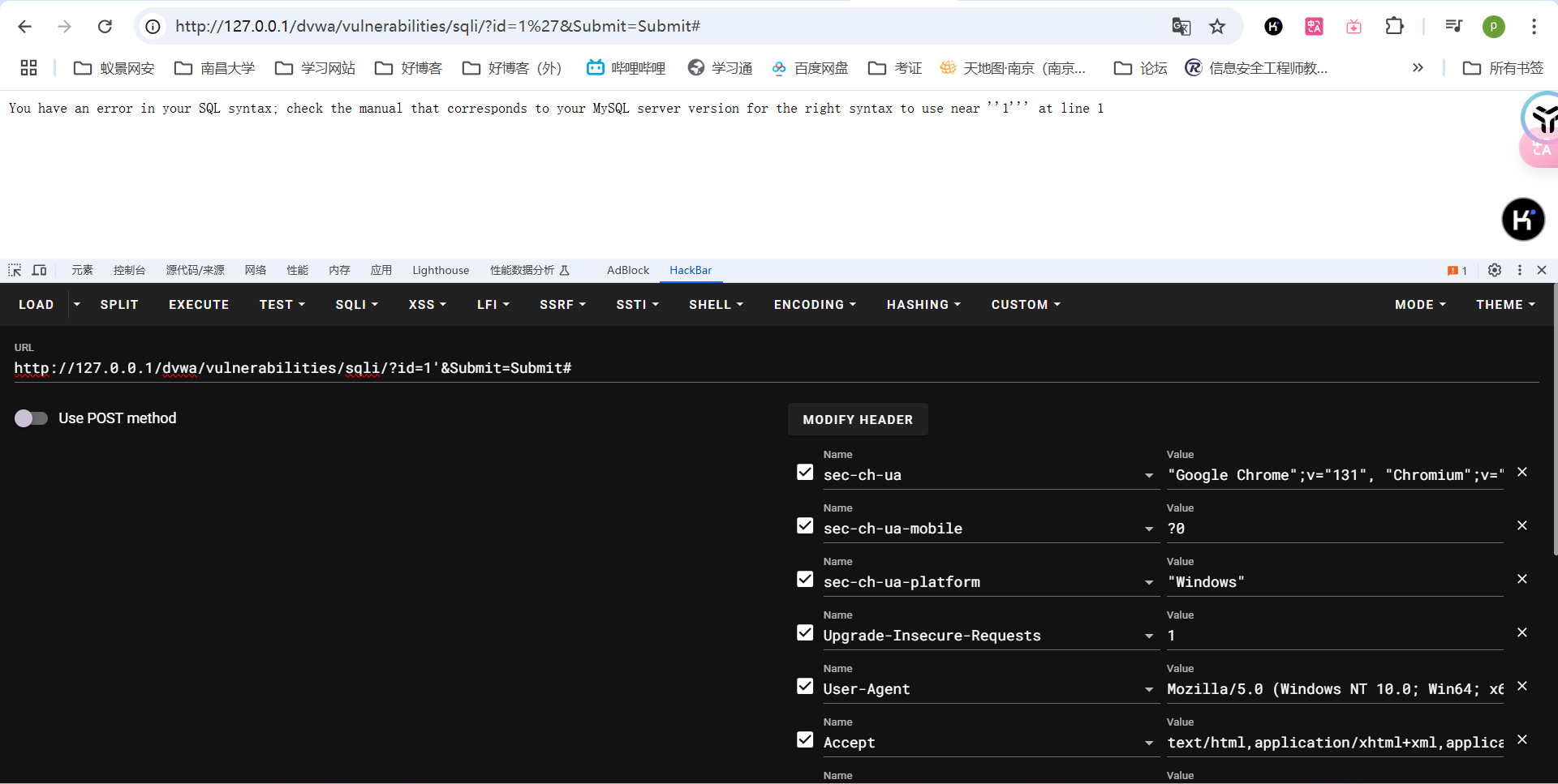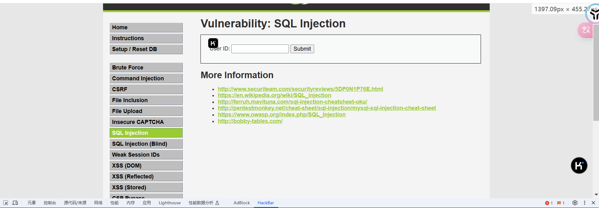 比如在dvwa靶场里输入 1' 很明显有报错提示,那很有可能有sql注入,有回显报错信息的也是最简单的注入情况。