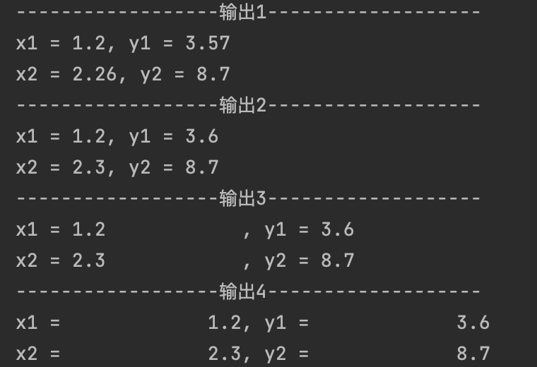1 # 用format()格式化,对输出项进行格式化 2 3 x1, y1 = 1.2, 3.57 4 x2, y2 = 2.26, 8.7 5 6 # 输出1 7 print('{:-^40}'.format('输出1')) # {:-^40}控制输出数据格式:宽度占40列,居中对齐,空白处用-补齐 8 print('x1 = {}, y1 = {}'.format(x1, y1)) 9 print('x2 = {}, y2 = {}'.format(x2, y2)) 10 11 # 输出2 12 print('{:-^40}'.format('输出2')) # {:-^40}控制输出数据格式:宽度占40列,居中对齐,空白处用-补齐 13 print('x1 = {:.1f}, y1 = {:.1f}'.format(x1, y1)) #{:.1f}控制小数输出精度,保留1位小数 14 print('x2 = {:.1f}, y2 = {:.1f}'.format(x2, y2)) 15 # 输出3 16 print('{:-^40}'.format('输出3')) # {:-^40}控制输出数据格式:宽度占40列,居中对齐,空白处用-补齐 17 print('x1 = {:<15.1f}, y1 = {:<15.1f}'.format(x1, y1)) #{:<15.1f}宽度占15列,小数部分占1列,左对齐,空白处默认补空格 18 print('x2 = {:<15.1f}, y2 = {:<15.1f}'.format(x2, y2)) 19 20 # 输出4 21 print('{:-^40}'.format('输出4')) # {:-^40}控制输出数据格式:宽度占40列,居中对齐,空白处用-补齐 22 print('x1 = {:>15.1f}, y1 = {:>15.1f}'.format(x1, y1)) #{:>15.1f}宽度占15列,小数部分占一列,右对齐,空白处默认补空格 23 print('x2 = {:>15.1f}, y2 = {:>15.1f}'.format(x2, y2))