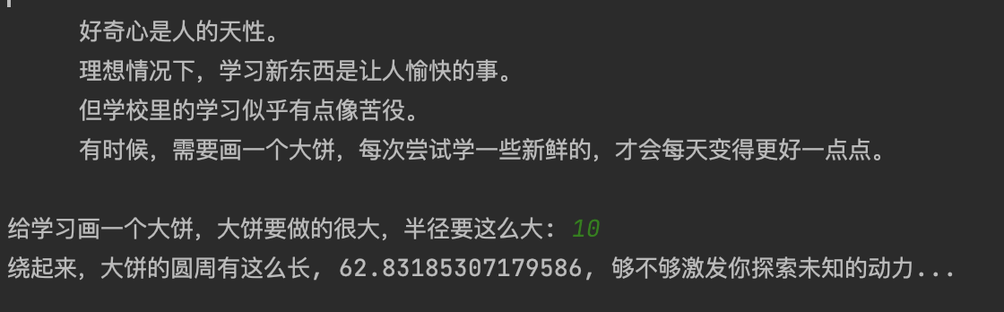 1 # 神奇的pi, 与大饼 2 3 import math 4 5 text = ''' 6 好奇心是人的天性。 7 理想情况下,学习新东西是让人愉快的事。 8 但学校里的学习似乎有点像苦役。 9 有时候,需要画一个大饼,每次尝试学一些新鲜的,才会每天变得更好一点点。 10 ''' 11 print(text) 12 13 r = float(input('给学习画一个大饼,大饼要做的很大,半径要这么大: ')) 14 15 circle = 2*math.pi*r 16 17 print(f'绕起来,大饼的圆周有这么长, {circle}, 够不够激发你探索未知的动力...')