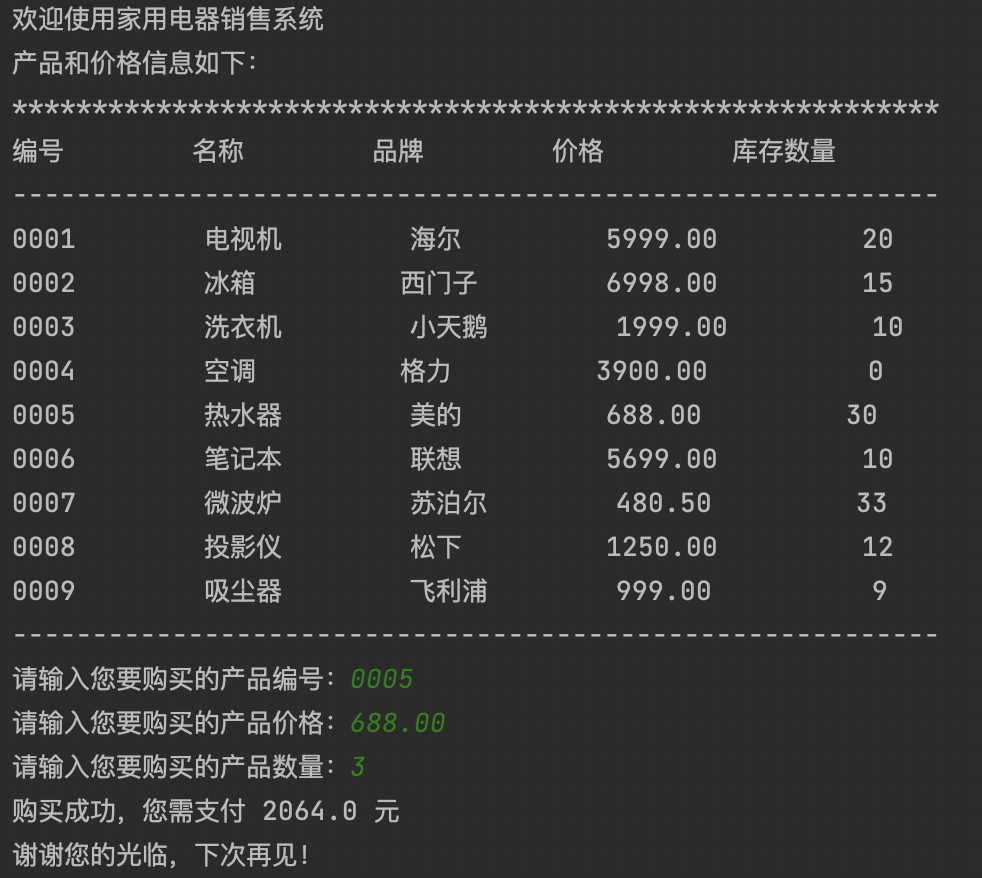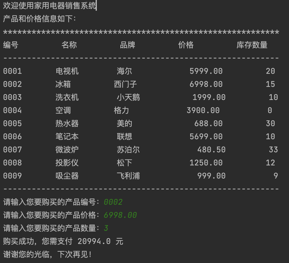 1 print('欢迎使用家用电器销售系统') 2 print('产品和价格信息如下:') 3 print(f'{"*":*<58}') 4 print(f'{"编号":<10}{"名称":<10}{"品牌":<10}{"价格":<10}{"库存数量":<10}') 5 print(f'{"-":-<58}') 6 print(f'{"0001":<10} {"电视机":<10} {"海尔":<10} {5999.00:.2f} {20:10}') 7 print(f'{"0002":<10} {"冰箱":<10} {"西门子":<10} {6998.00:.2f} {15:10}') 8 print(f'{"0003":<10} {"洗衣机":<10} {"小天鹅":<10} {1999.00:.2f} {10:10}') 9 print(f'{"0004":<10} {"空调":<10} {"格力":<10} {3900.00:.2f} {0:10}') 10 print(f'{"0005":<10} {"热水器":<10} {"美的":<10} {688.00:.2f} {30:10}') 11 print(f'{"0006":<10} {"笔记本":<10} {"联想":<10} {5699.00:.2f} {10:10}') 12 print(f'{"0007":<10} {"微波炉":<10} {"苏泊尔":<10} {480.50:.2f} {33:10}') 13 print(f'{"0008":<10} {"投影仪":<10} {"松下":<10} {1250.00:.2f} {12:10}') 14 print(f'{"0009":<10} {"吸尘器":<10} {"飞利浦":<10} {999.00:.2f} {9:10}') 15 print(f'{"-":-<58}') 16 # 用户输入信息 17 product_id = input('请输入您要购买的产品编号:') 18 price = float(input('请输入您要购买的产品价格:')) 19 count = int(input('请输入您要购买的产品数量:')) 20 #计算金额 21 print('购买成功,您需支付', price*count, '元') 22 #退出系统 23 print('谢谢您的光临,下次再见!')