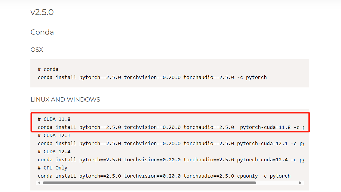 1.打开https://pytorch.org/get-started/previous-versions/选择对应cunda版本的pytorch,通过win+r打开cmd,输入nvccc -V查看本机安装的cuda的版本,我这里是【cuda_11.8】,输入nvidia-smi,显示输出显示本机显卡CUDA Version:12.7【说明最高支持cuda版本为12.7,2025.5最新的pytorch已经支持2.7版本,这里以安装2.5版本说明.