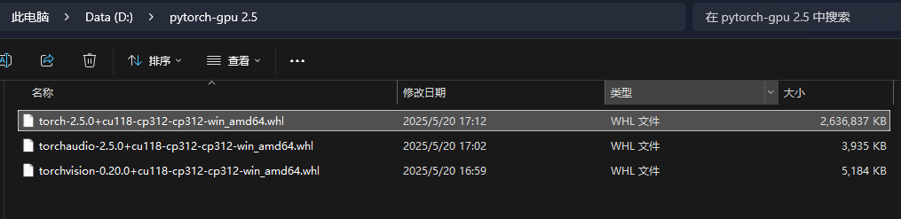 2.对应找到了pytorch2.5.0 torchvision0.20.0 torchaudio2.5.0版本,这里选择离线安装,先在https://download.pytorch.org/whl/地址去下载对应的pytorch2.5.0 torchvision0.20.0 torchaudio2.5.0
